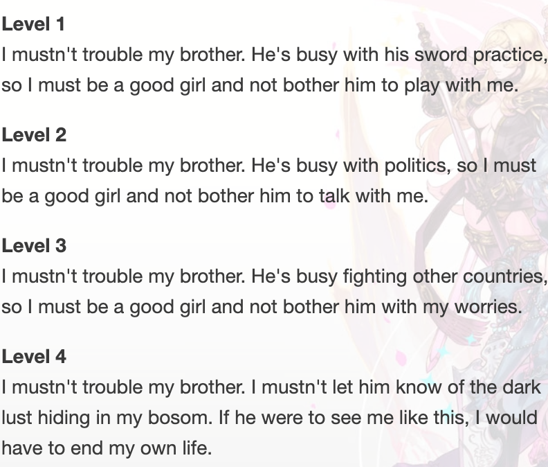 A life of constant dishonesty in combination with the isolation required to maintain the seal as the goddess has left Furiae tired with certain indifference towards even the potential ending of the world as it takes its toll on her body. The treasured days of her youth as a princess with Caim and Inuart lost to a secluded tower of only the bare minimum living amenities, by the timeline of the game itself, Furiae can almost hardly be considered alive. What keeps her going is her love for Caim, a quiet, hidden candle always burning in her chest. As long as she knows that her older brother is out there somewhere, loving her even if only in a familial way, Furiae trudges on with graceful diligence.
